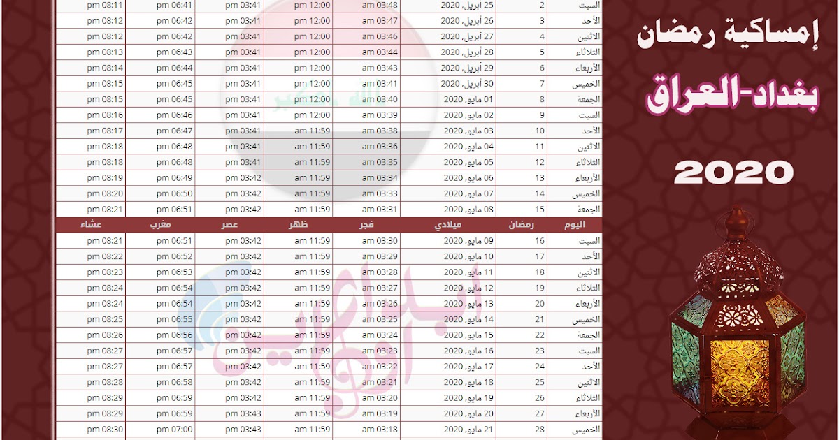 امساكية شهر رمضان بغداد رمضان 1442 2020