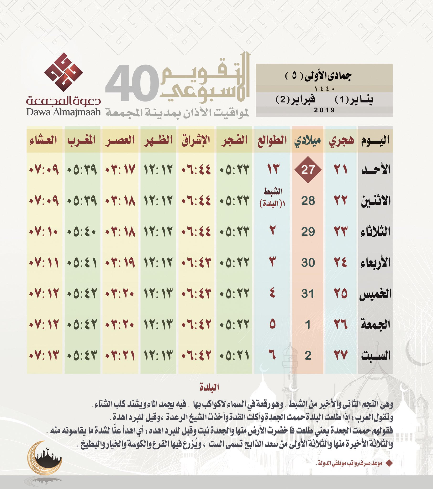 جمعية الدعوة بالمجمعة On Twitter التقويم الأسبوعي لمواقيت الأذان بمدينة المجمعة حسب تقويم أم القرى جمادى الأولى ٥ ١٤٤٠هـ يناير 1 فبراير 2 2019م الشبط النعايم البلدة Https T Co Kdemqaptgf